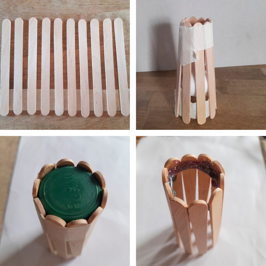 - Liimaa kuumaliimalla yläosasta kiinni. Voit halutessasi myös liimata limsapullon korkin rakenteen tueksi. Poista teipit.